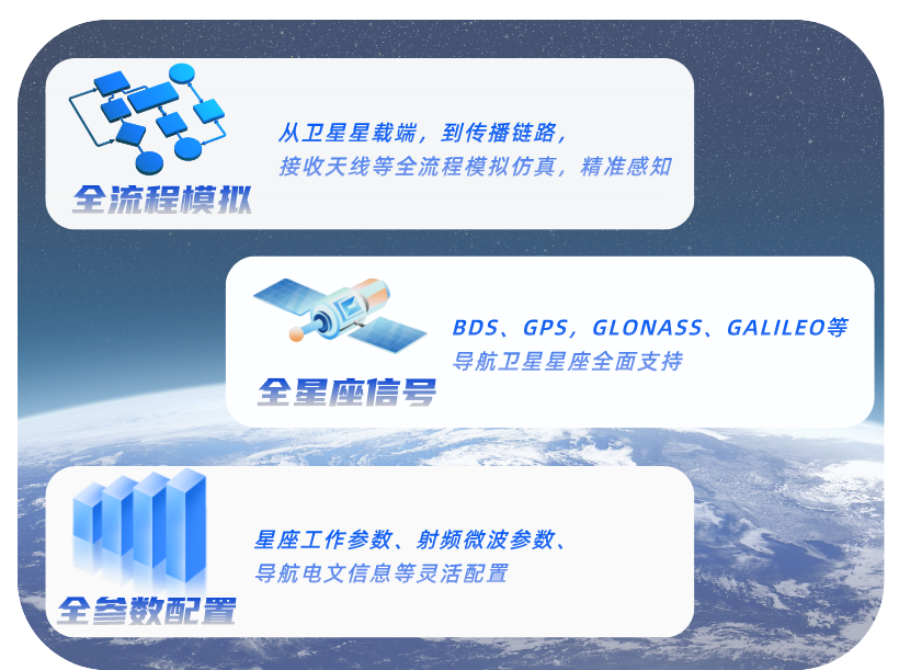 支持全球四大導航衛星星座、9個頻點,并可根據需求擴展頻點,支持靜態、動態、軌跡注入多種模擬仿真模式。